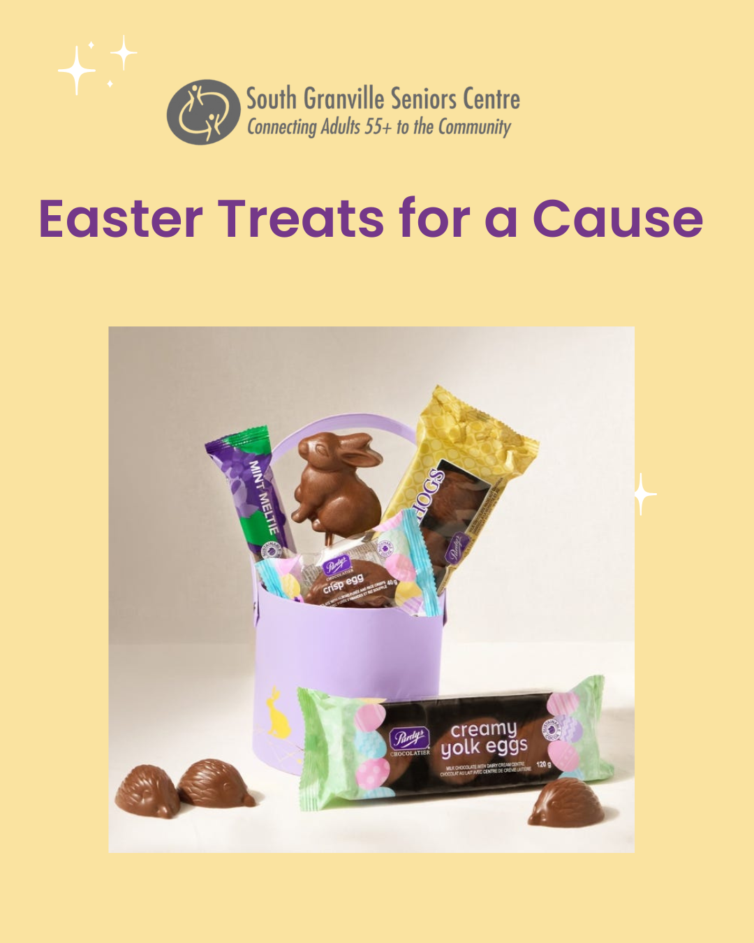 This Easter, enjoy something sweet while supporting a meaningful cause! We are partnering with Purdy’s Chocolatier to raise funds for our Sponsor a Senior program, which helps ensure local seniors can access programs, activities, and community support at South Granville Seniors Centre.