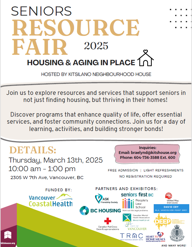 Don’t miss this chance to learn, connect, and discover valuable resources for seniors! For inquiries, contact braelynd@kitshouse.org or call 604-736-3588 Ext. 600. We look forward to seeing you there!